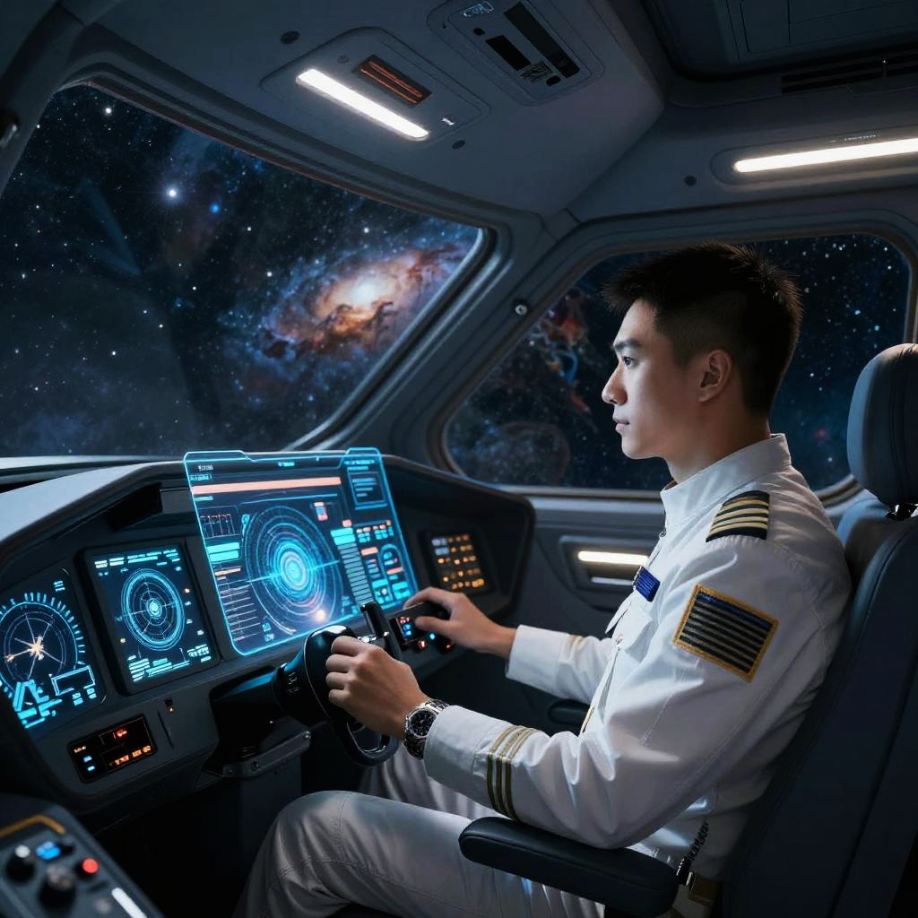 Leon Yang as a futuristic pilot inside a sleek spaceship cockpit, controls illuminated with holographic displays, stars and distant nebulae visible through the windows, showcasing a blend of high-tech design and cosmic vastness in a cinematic style.