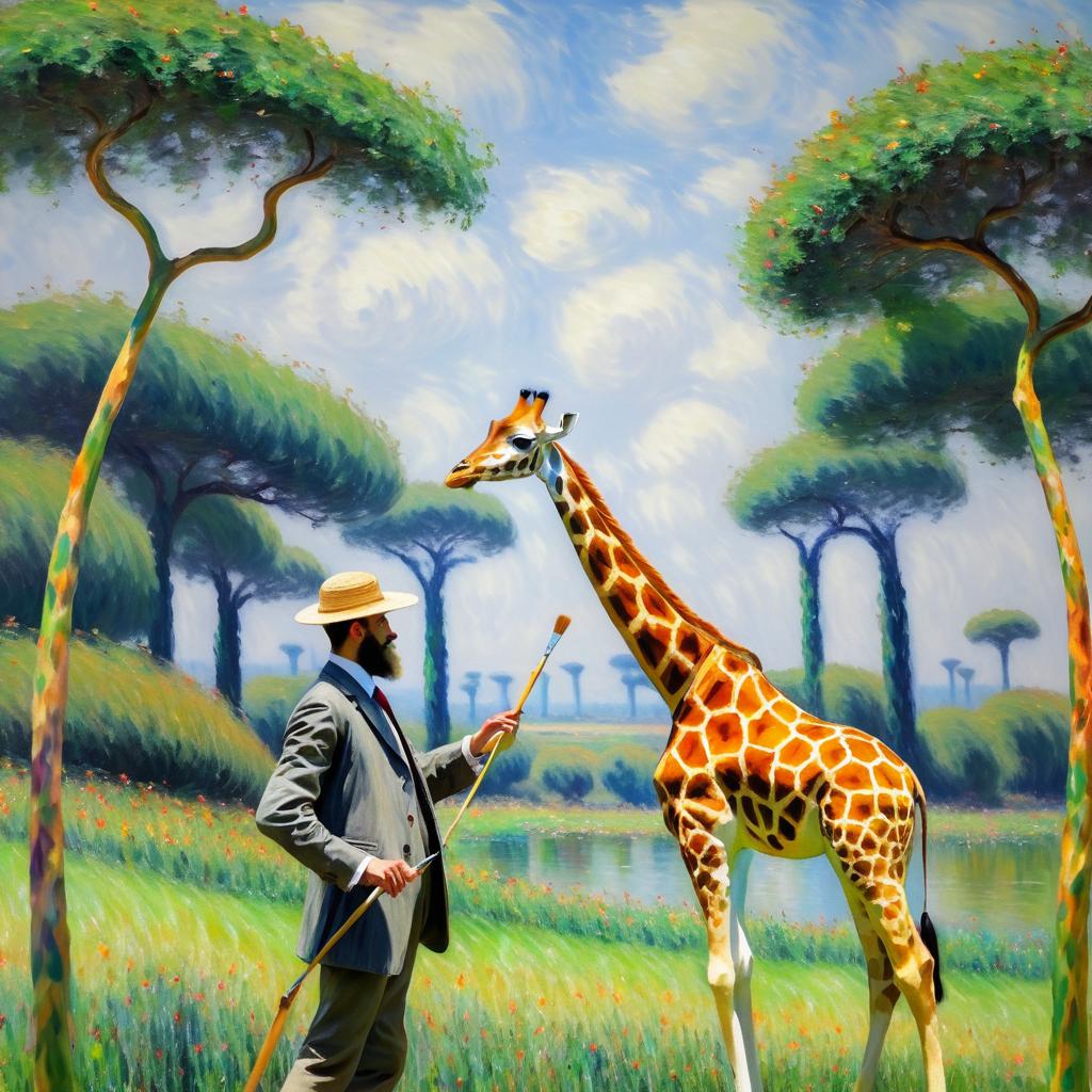 Giraffe by Claude Monet holding a paintbrush, creative and surreal composition.