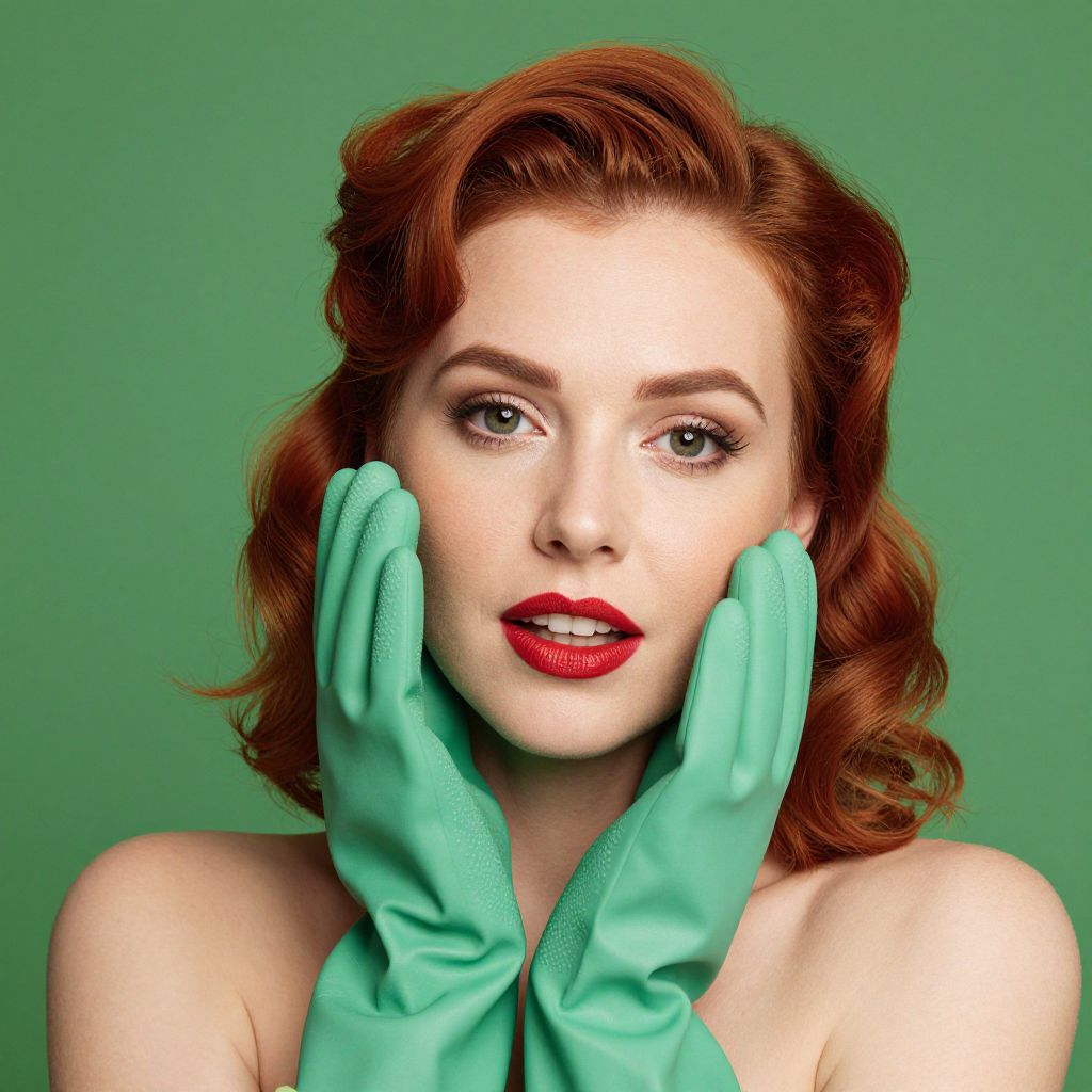 Woman with vibrant red hair styled in retro waves, wearing bright green latex gloves, gently touching her face against a solid green background.