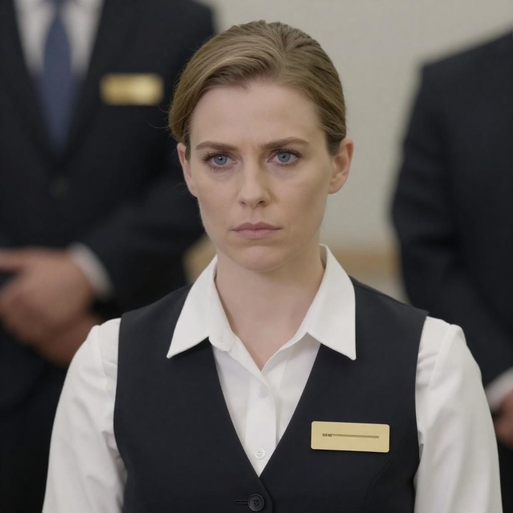 Photograph of a serious-looking woman with light brown hair in a neat side part, wearing a white collared shirt under a black vest. She has blue eyes and a focused expression. The background is blurred, featuring dark and light tones. A name badge is visible on her vest.