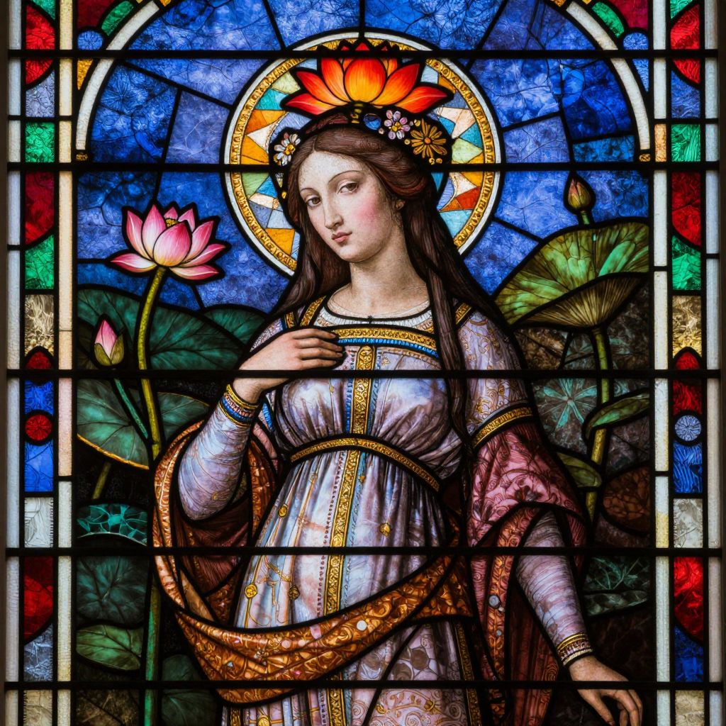 Stained glass artwork of a serene, long-haired, brown-eyed Madonna with a flower crown, wearing a patterned robe, surrounded by lotus flowers