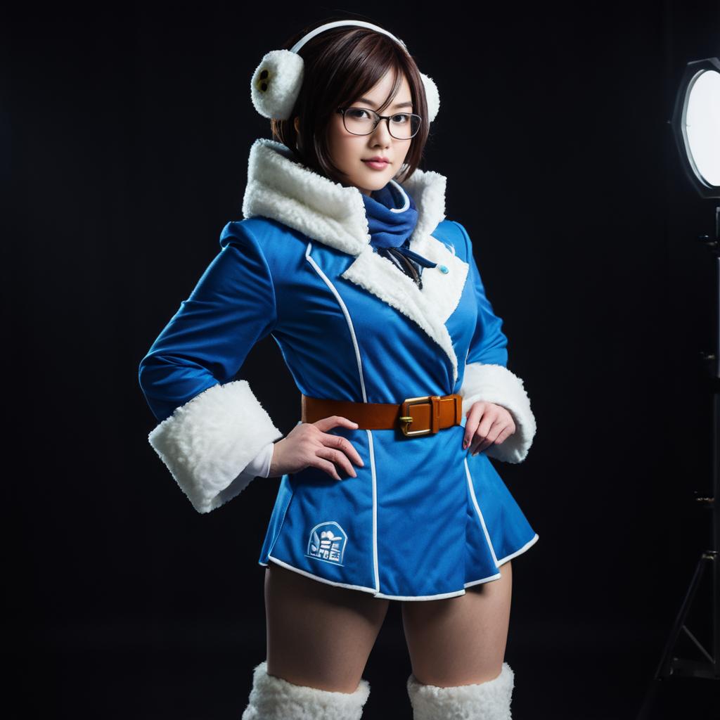 A young Asian woman dressed in a detailed, blue and white cosplay costume inspired by Mei Terumi, a character from the popular anime series. She wears a blue bodysuit with white fur trim on the sleeves and collar, along with matching blue thigh-high accessories with white pom-poms. The costume includes a fur belt with a circular blue emblem and a distinguishing orange flower patch on her chest. She also wears glasses and earmuffs, completing the realistic cosplay look against a black background.