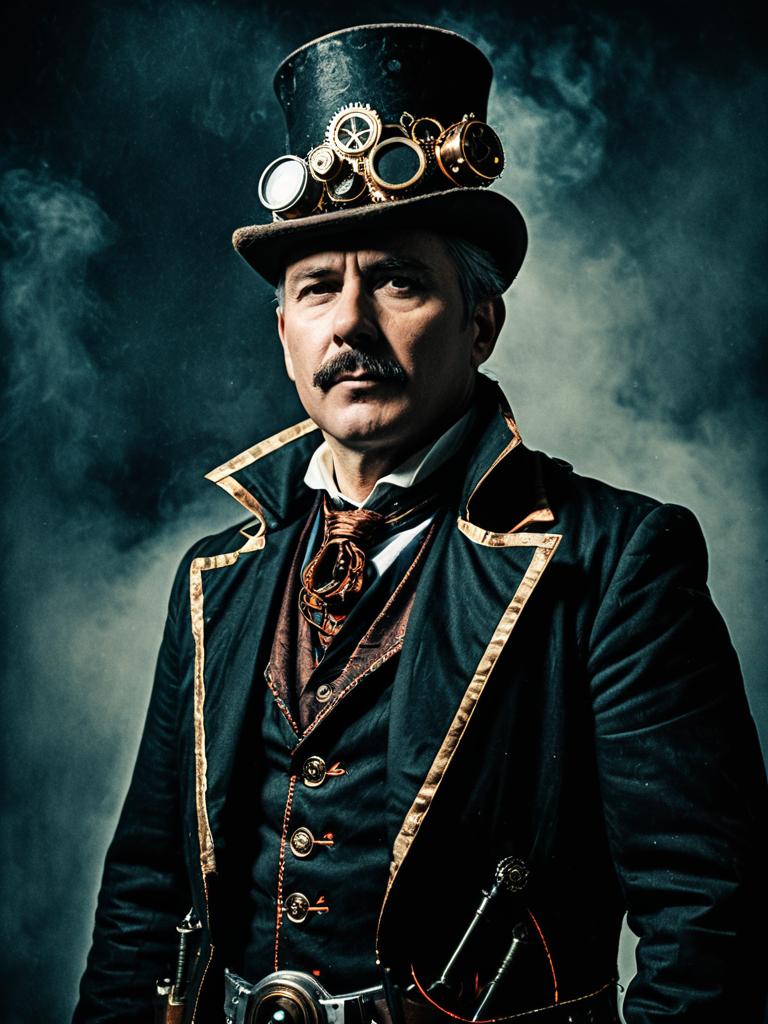 Man in Steampunk Halloween costume, cinematic realism, dramatic portrait