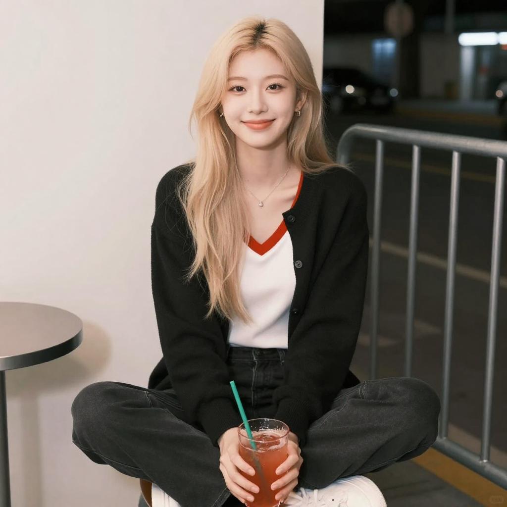 Photograph of a young woman with long, blonde hair, wearing a black coat, holding a clear glass of a light-colored drink in her right hand. She has light skin and is looking slightly to the left with a neutral expression. The background shows a dimly lit room with a dark wall and a white cabinet.