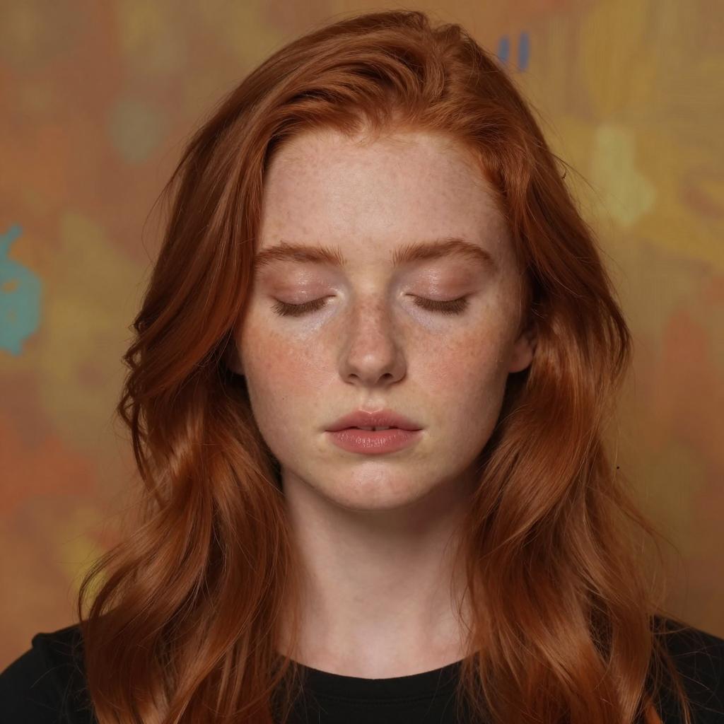 A close-up portrait of a young woman with long wavy red hair and closed eyes, soft warm lighting highlighting her smooth skin and natural freckles, detailed realistic facial features with subtle makeup, painterly background with textured warm colors like gold, orange, and hints of turquoise, wearing a simple black top, serene and calm expression