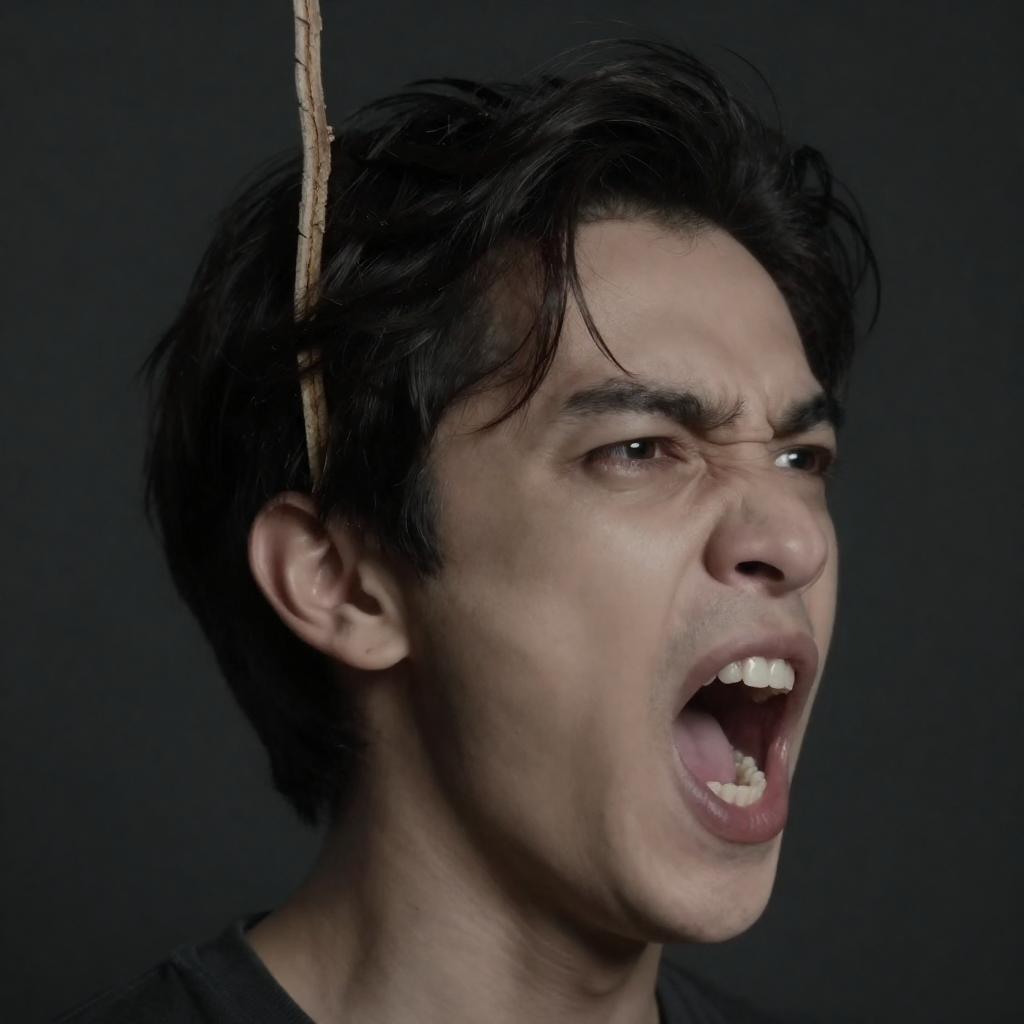 Photograph of a pale-skinned, heavily makeuped man with a dark mask, white hair, and exaggerated features. He has an open mouth with sharp teeth, wearing a dark jacket, gripping his chest. Dimly lit background with a shadowy wall.