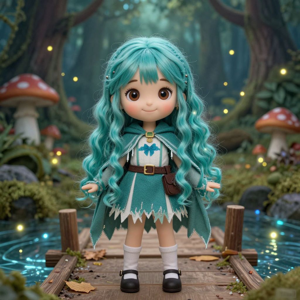 Digital art of a cute anime-style doll with long, wavy turquoise hair and large brown eyes. She wears a green, tattered cloak with a white shirt and blue emblem, brown belt, and white socks with black Mary Jane shoes. She stands on a wooden plank bridge over a glowing, crystal-clear stream in a mystical forest. The background features glowing fireflies, large red and white mushrooms, and blurred trees. The scene is lush and enchanting, with a magical, whimsical atmosphere. The doll's expression is cheerful and inviting.