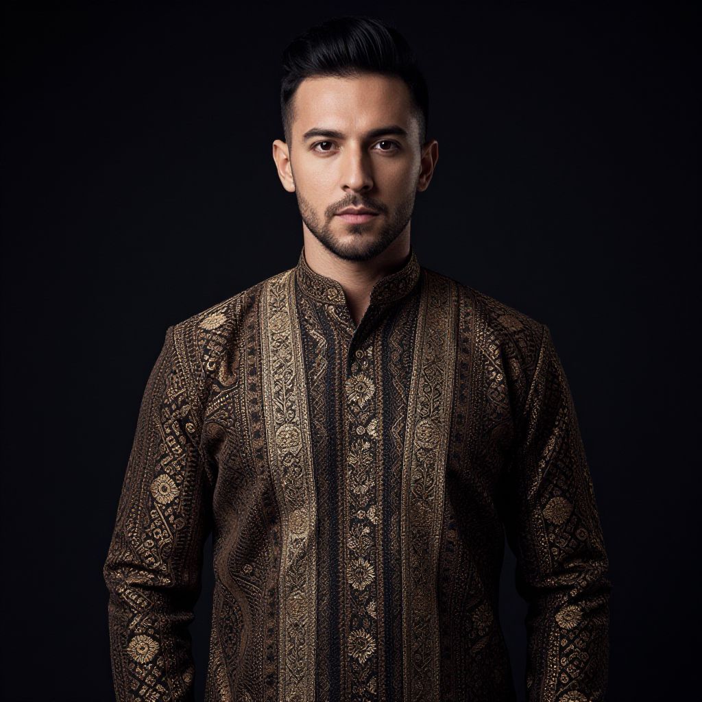A striking portrait of a man dressed in traditional attire, showcasing intricate patterns that highlight cultural heritage. The dark background complements the striking details of the outfit, exuding elegance and sophistication.