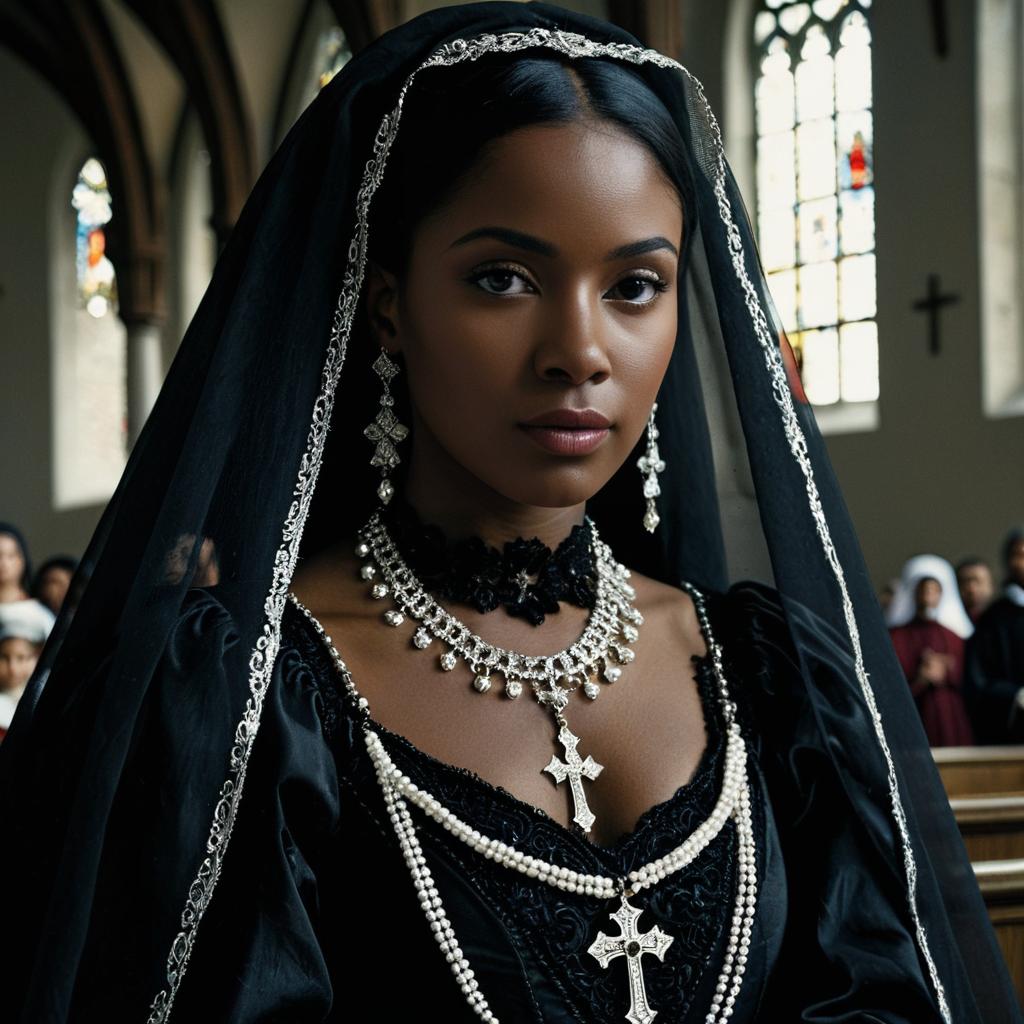 Portrait of a dark-skinned woman wearing a black Renaissance-style dress with long sleeves, adorned with layered pearl and jeweled necklaces featuring cross pendants. She has a black veil with silver trim and matching dangling earrings, standing inside a church with stained glass windows and wooden pews visible in the background.