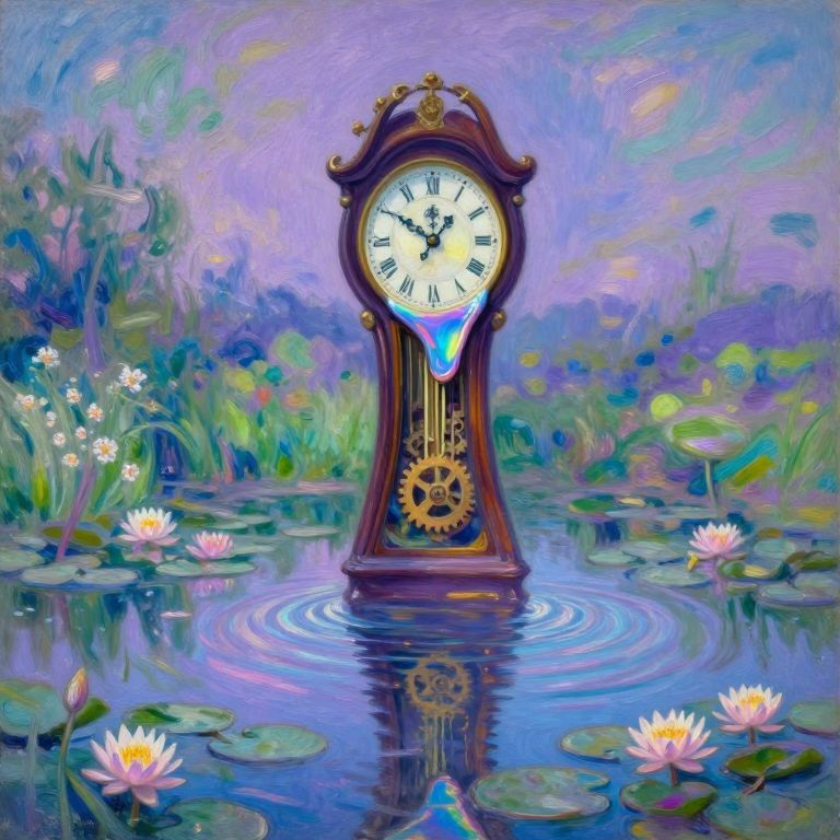 A surreal landscape merges the whimsical melting clock with the serene water lilies garden, creating an enigmatic scene where reality intertwines with dreams. A colossal grandfather clock stands tall amidst a tranquil pond, its clock face replaced by a mesmerizing pool of iridescence. The tower emerges from the shimmering surface, its intricate gears and cogs visible beneath the gentle ripples, evoking both wonder and curiosity. In the background, impressionistic brushstrokes paint an atmospheric tapestry of lavender, azure, and emerald hues, enveloping the viewer in a mysterious ambiance that blurs the boundaries between time and memory. This captivating composition invites spectators on a journey through their own subconscious, blending surrealism's playful elements with the tranquil essence of Impressionism to create a visually alluring masterpiece.