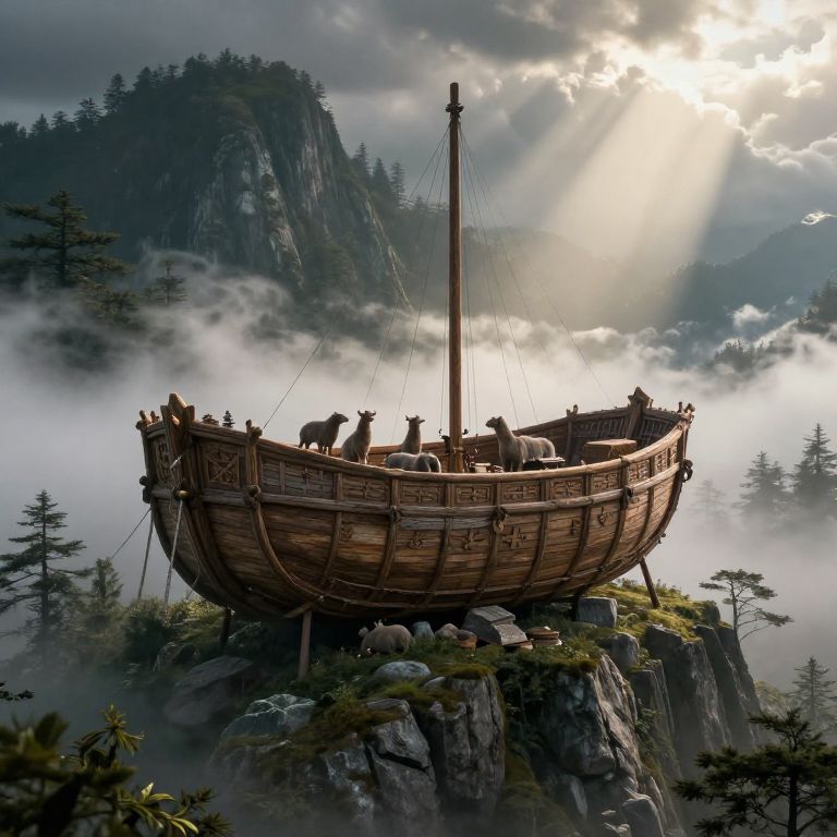Noahs ancient ark resting on a mountain ridge surrounded by mist and dense forest, sunlight piercing through clouds illuminating the detailed woodwork and pairs of animals, epic fantasy style with rich textures and atmospheric depth.