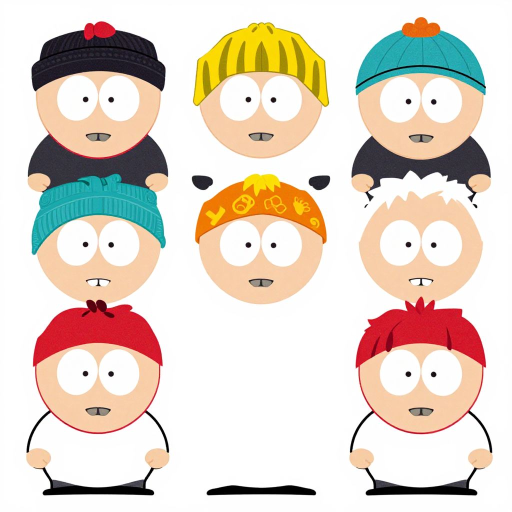 Create a South Park character template displaying a blank character base in the classic 2D cutout animation style, including separate layers for mouth, eyes, hats, and body parts in bold colors and thick outlines, ready for personalization with various costumes and accessories.