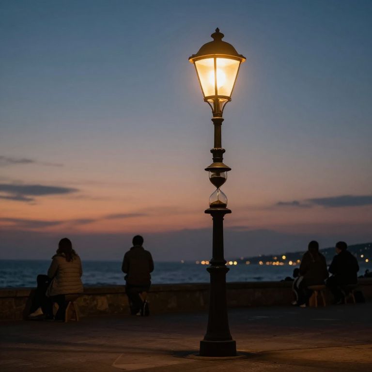 Amidst the quiet hum of twilight, a streetlamp crafted from stacked hourglasses casts a warm, contemplative glow, symbolizing the paradoxical stillness of time as it silently measures the fleeting moments of those who pause beneath its luminous embrace.