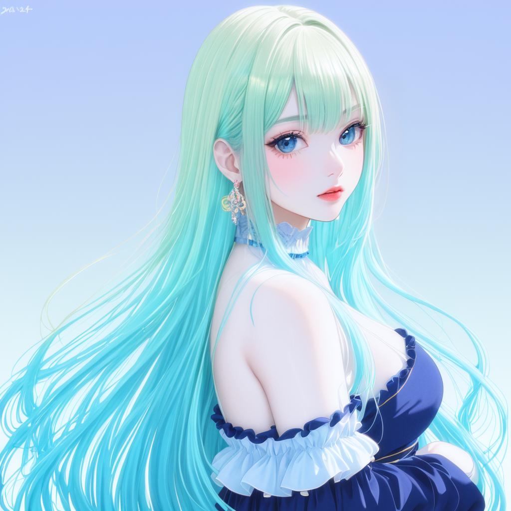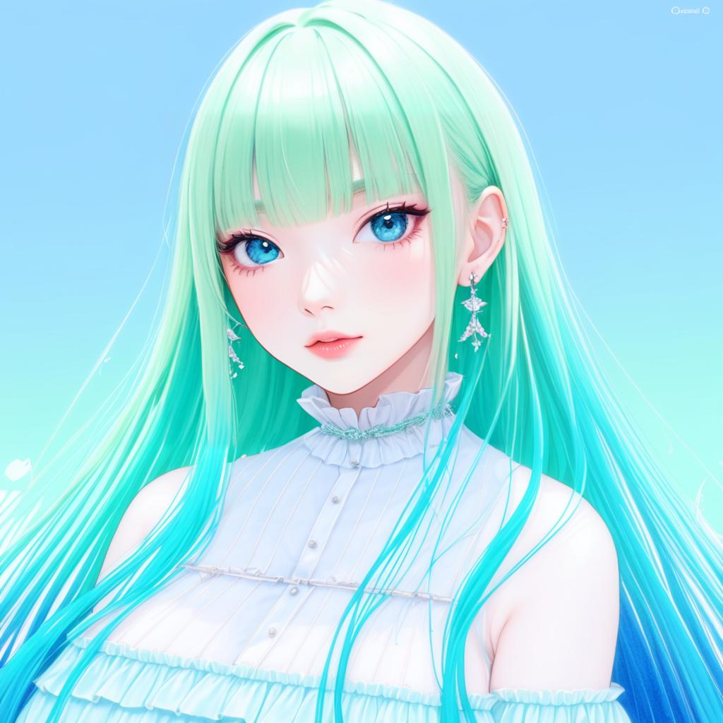 Close-up portrait of an anime-style girl with long gradient hair transitioning from green to blue. She has large blue eyes, blunt bangs, and wears a white ruffled top with bare shoulders. The girl also wears delicate silver star-shaped earrings. The background is a soft gradient of light blues, enhancing the vibrant colors of her hair and eyes.