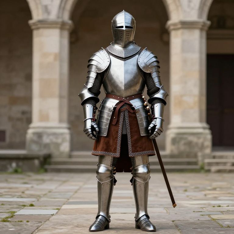 Photograph of a medieval knight in full plate armor standing in a stone courtyard with an arched doorway in the background. The knight wears a polished steel helmet with a visor, and his armor includes a chest plate, shoulder guards, gauntlets, and greaves. A brown, heavily embroidered cloth is tied around his waist, and he holds a sword in his right hand. The courtyard has a cobblestone floor with patches of grass. The stone arches and walls behind him are weathered, adding a historic ambiance. The knight's stance is confident and upright, with his arms slightly relaxed at his sides.