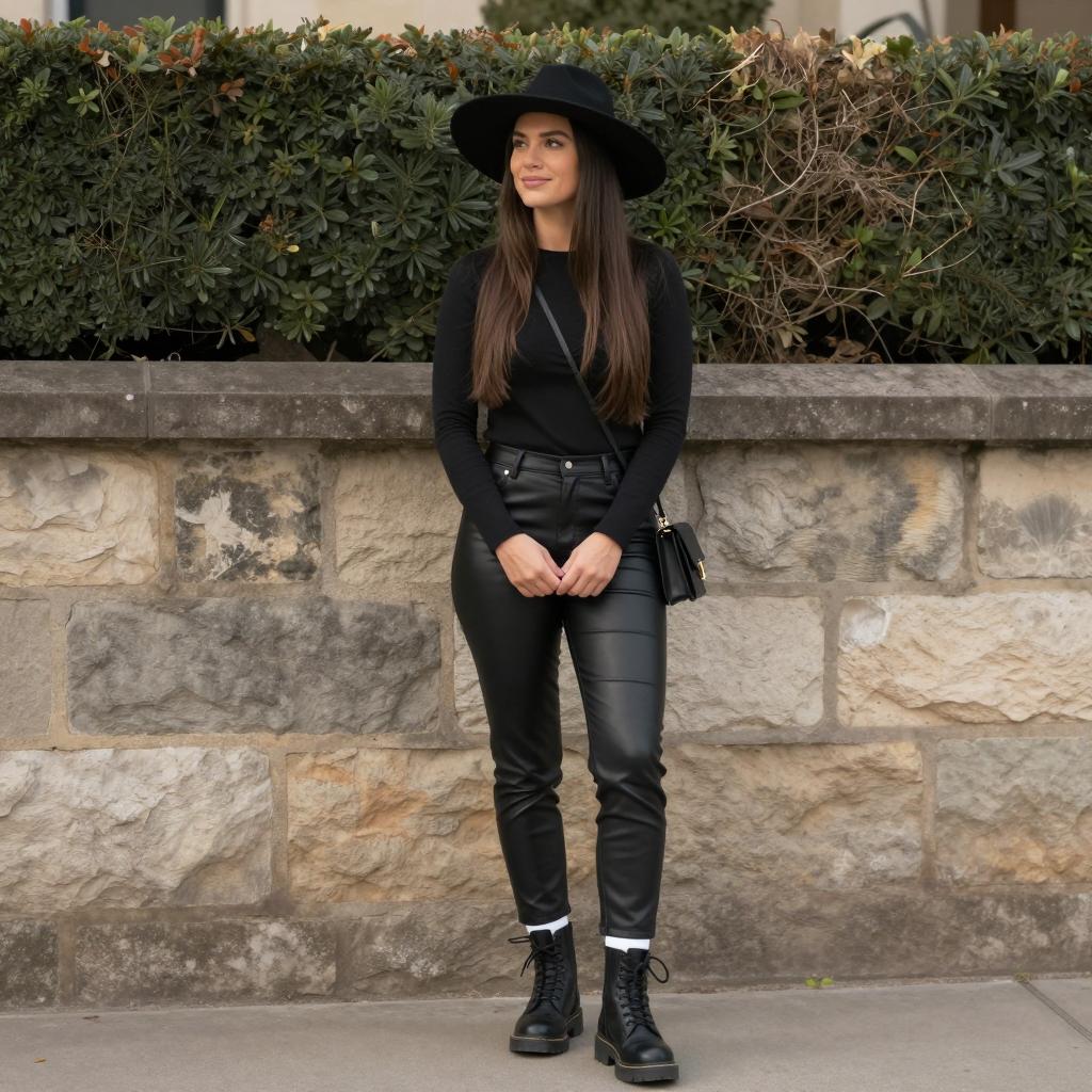 Woman standing outdoors against a stone wall with a hedge in the background. She has long, straight brown hair, wears a black wide-brimmed hat, black long-sleeve top, black leather pants, black combat boots with white socks, and a small black crossbody bag. She looks to the right with a slight smile. Her hands are clasped in front of her. The ground is paved.