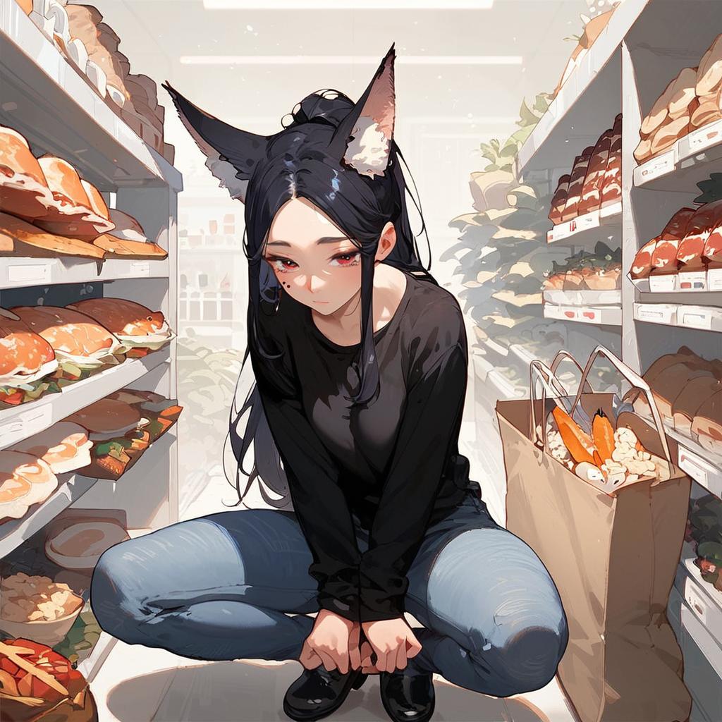 Digital anime-style illustration of a mature female character with long black hair, yellow tsurime eyes, and fox ears. She is wearing a black shirt, light blue jeans, and black shoes, squatting with legs spread inside a shop aisle filled with various breads and food items. A large shopping bag with groceries is visible nearby. The background is detailed, featuring shelves stocked with food products.