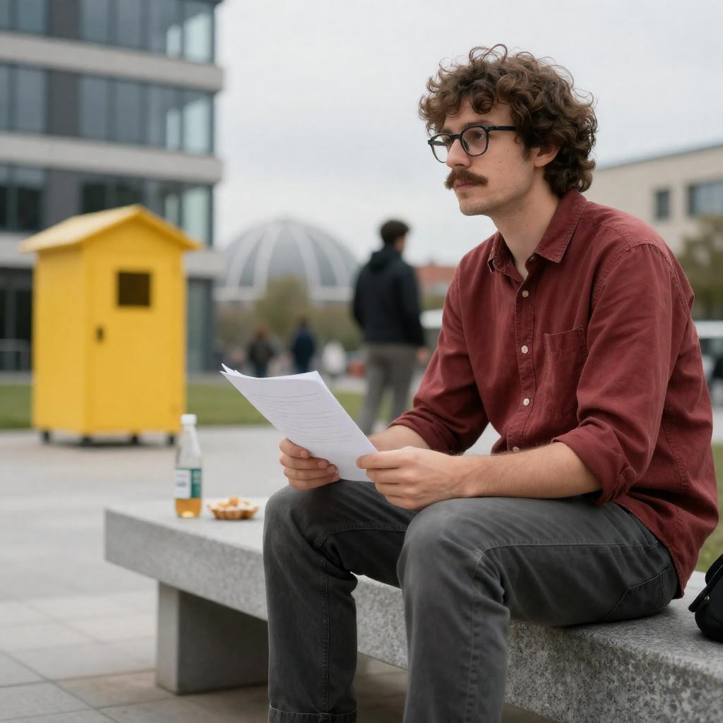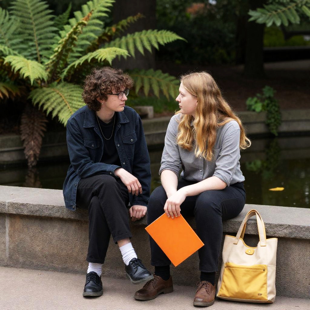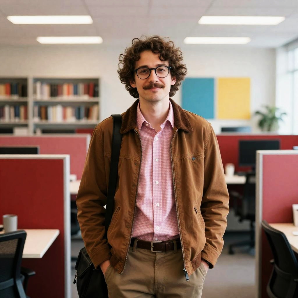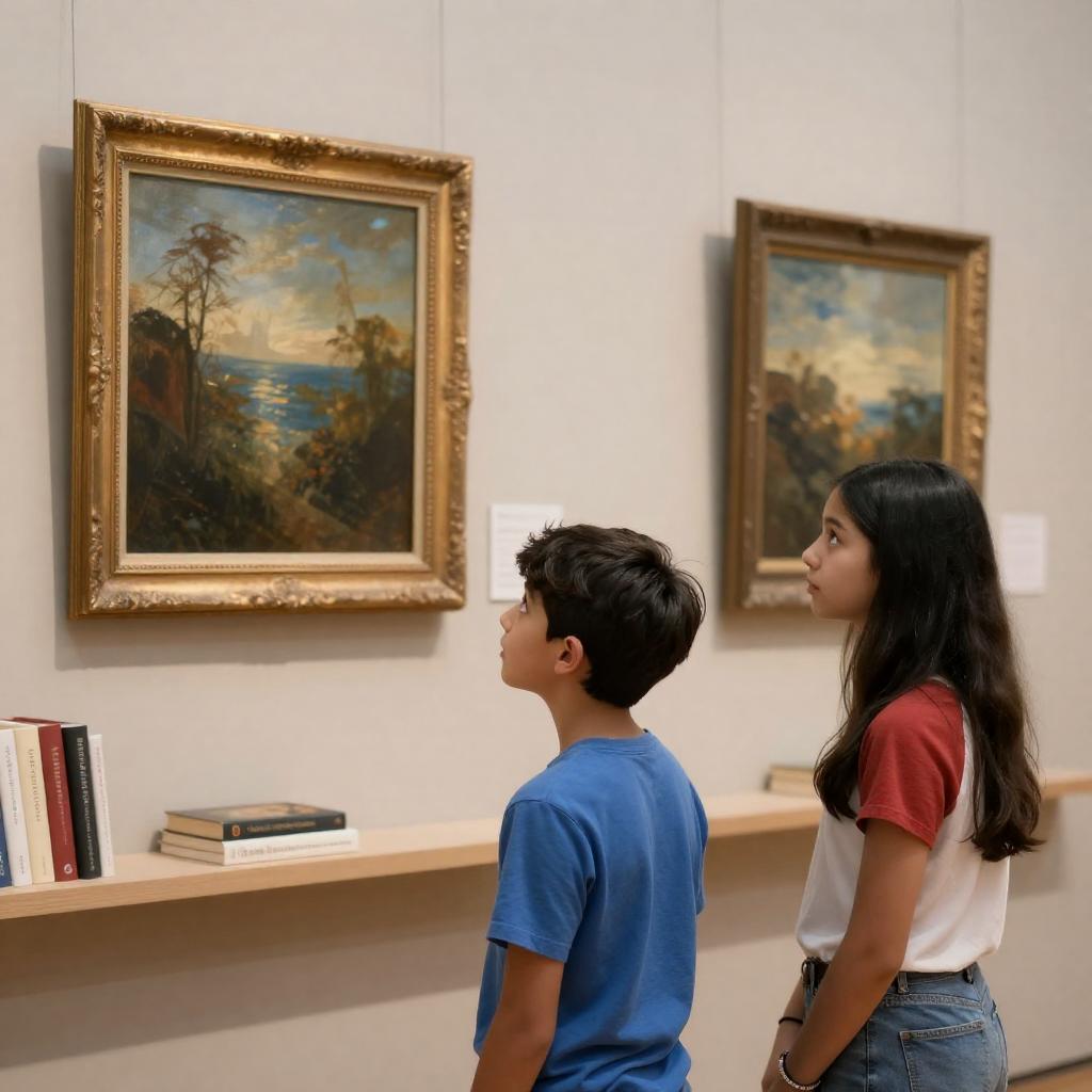 Photograph of a museum hallway. A man with curly hair, mustache, glasses, brown jacket, red shirt, and gray pants stands left, looking forward. A woman with long black hair, glasses, patterned sleeveless top, and dark skirt stands right, smiling. Both carry bags. Background: arched ceiling, lit exhibits, people walking.