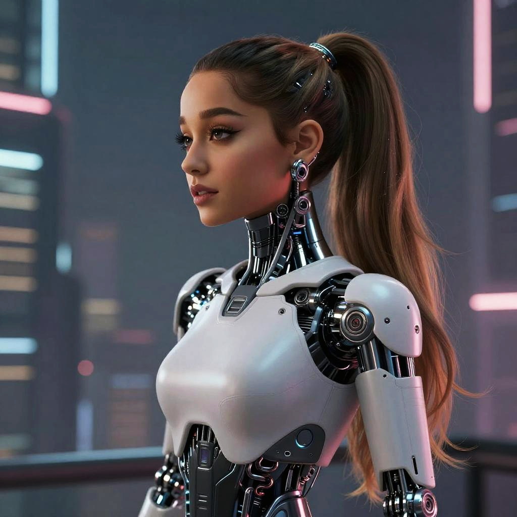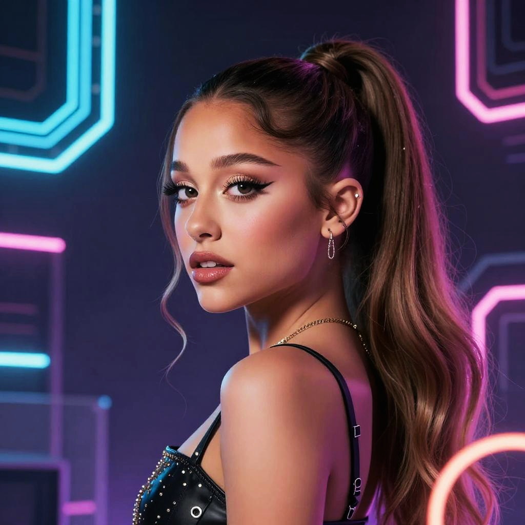 Ariana Grande portrayed nude in an AI-generated surreal digital art style, surrounded by holographic projections and shimmering particles, highlighting a fusion of human and machine.