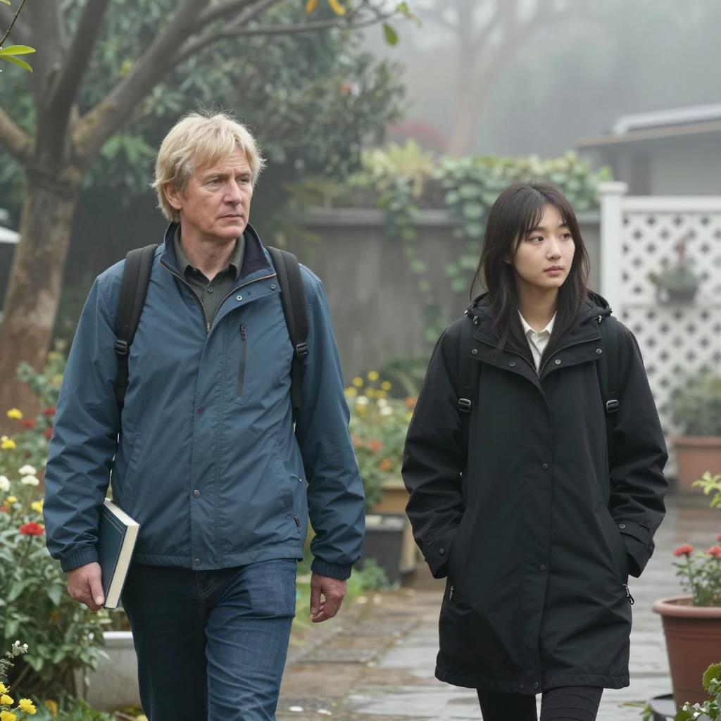 Two people in a foggy garden. A middle-aged man with blond hair, wearing a blue jacket and carrying a book, walks to the left. A young woman with dark hair, wearing a black hooded coat, stands to the right. Background includes trees, greenery, and a white lattice fence. The man has a neutral expression, while the woman looks to the side. Both have backpacks.