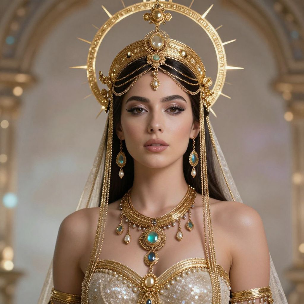 Chel El Dorado sexy, elegant high priestess adorned with golden headdress and delicate jewelry, ethereal atmosphere, soft glowing light, detailed ornate decorations, ethereal beauty