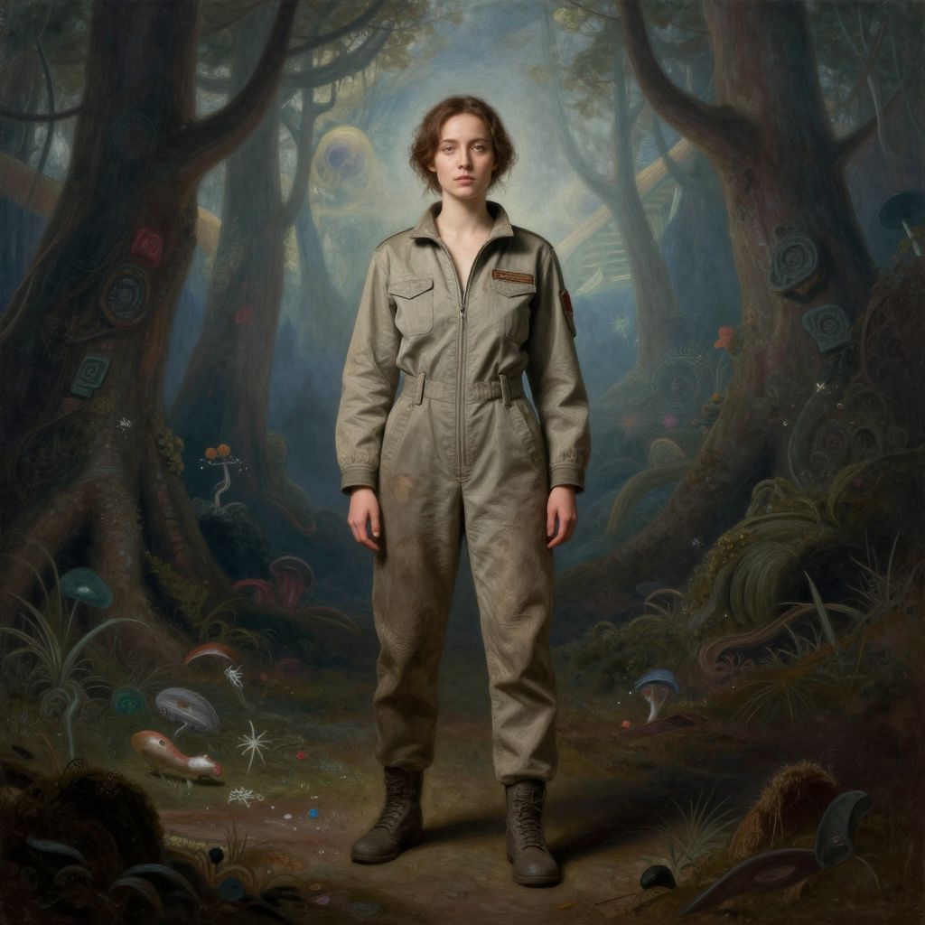 A woman in a tattered flight suit stands in a mysterious, dreamy, alien forest, painted in a neoclassical style reminiscent of Basil Gogos.