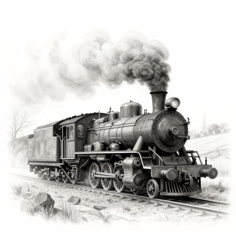 Black-and-white digital drawing of a vintage steam locomotive with billowing smoke, detailed iron wheels, and a rustic, grassy background.