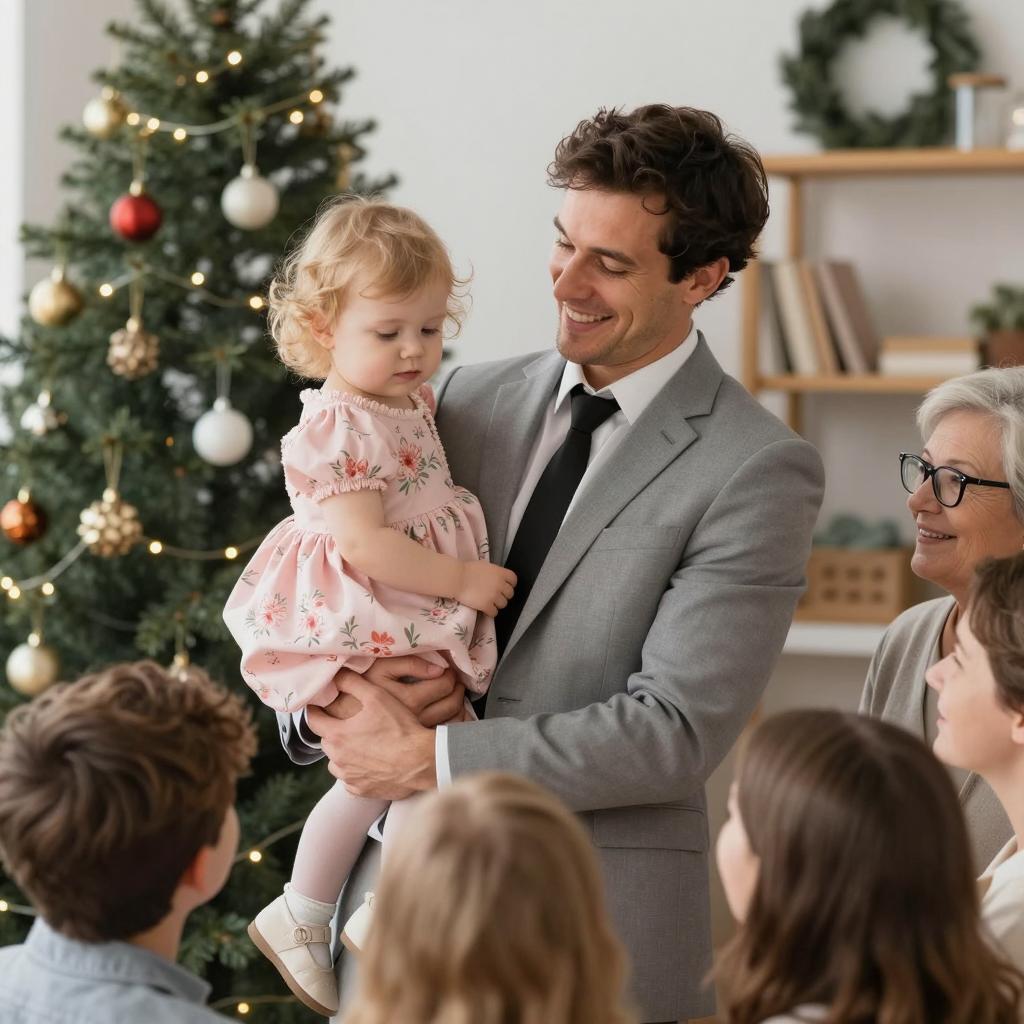 Black and white photograph of a man with dark hair in a cardigan and white shirt, kneeling beside a young girl with curly blonde hair in a light-colored dress, holding a small bouquet of flowers. They are indoors, in front of a crib with a partially visible sign. The man looks at the girl with a gentle expression. The girl looks at the flowers. The man's right hand holds the bouquet, while the girl's left hand touches it. The man is on the right, the girl is on the left. The crib is in the background on the left. Two blurred figures are in the background on the left.