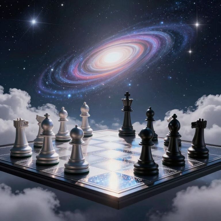 Giant chess pieces stand solemnly on a shimmering, reflective board suspended against a cosmic backdrop, where celestial light and clouds converge in a surreal tableau of strategy and wonder.