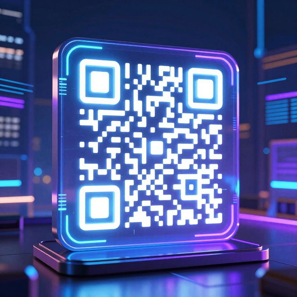 A glowing AI QR code displayed within a sleek, high-tech digital interface featuring neon blue and purple tones. The background depicts a cyberpunk city atmosphere with holographic data streams and vibrant futuristic details, emphasizing innovation and advanced technology.