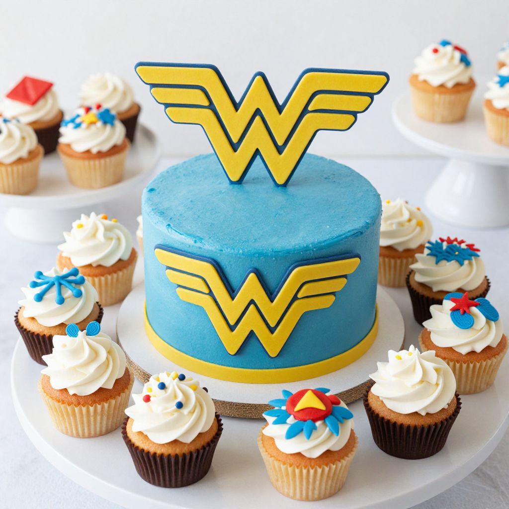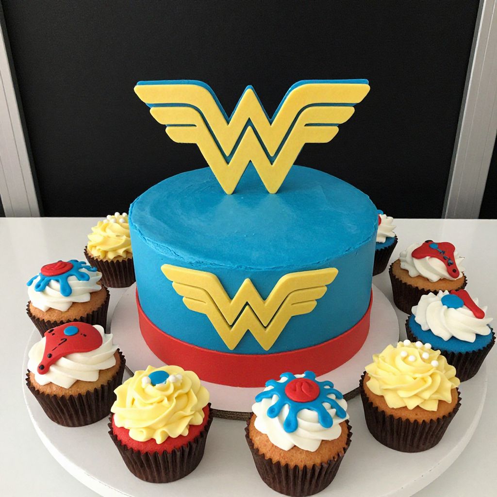 A whimsical celebration of superhero-inspired confections, where Wonder Woman's iconic emblem and colors transcend reality to adorn a perfectly round cake and cupcakes, creating a dreamlike tableau of bold, fantastical design.