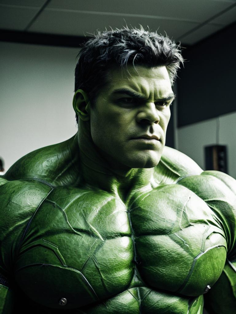 Man in Hulk costume, photorealistic detailed editorial portrait