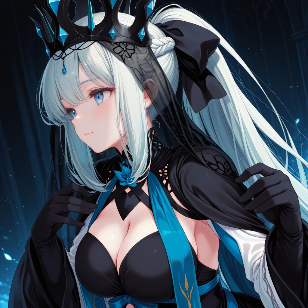 Morgan le fay (queen of winter) (fate), fate/grand order, 1girl, blue lips, blue eyes, very long hair, grey hair, white hair, ponytail, sidelocks, french braid, braid, large breasts, black dress, two-tone dress, veil, black gloves, long sleeves, wide sleeves, crown, by artist komone ushio, dark_illustrious