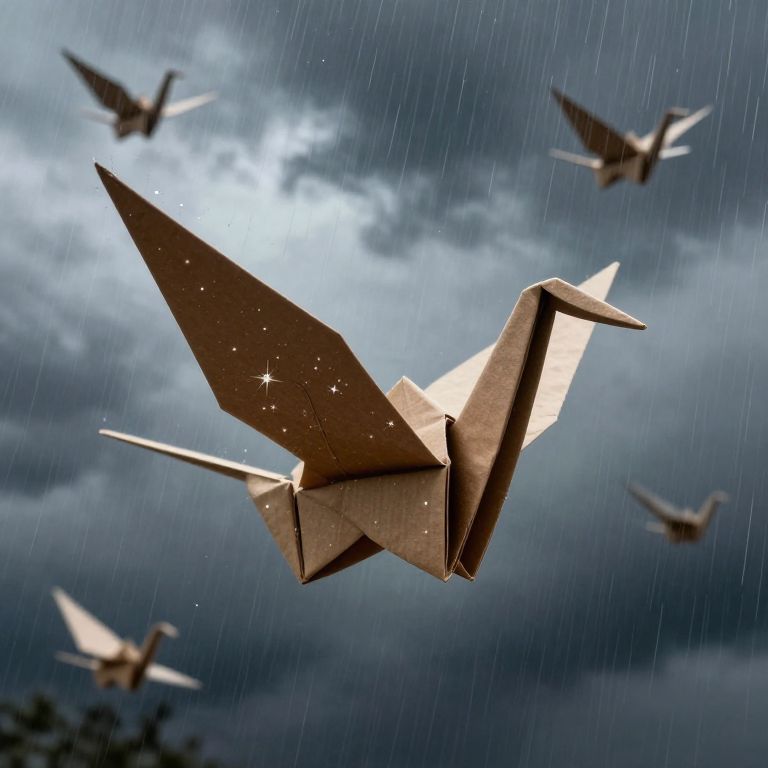 Gigantic origami cranes, their wings crafted from cardboard and stardust, soar through a tempestuous sky, carrying whispers of hope and dreams amidst a downpour of eureka moments, where the weight of wonder lifts them higher into the boundless expanse.