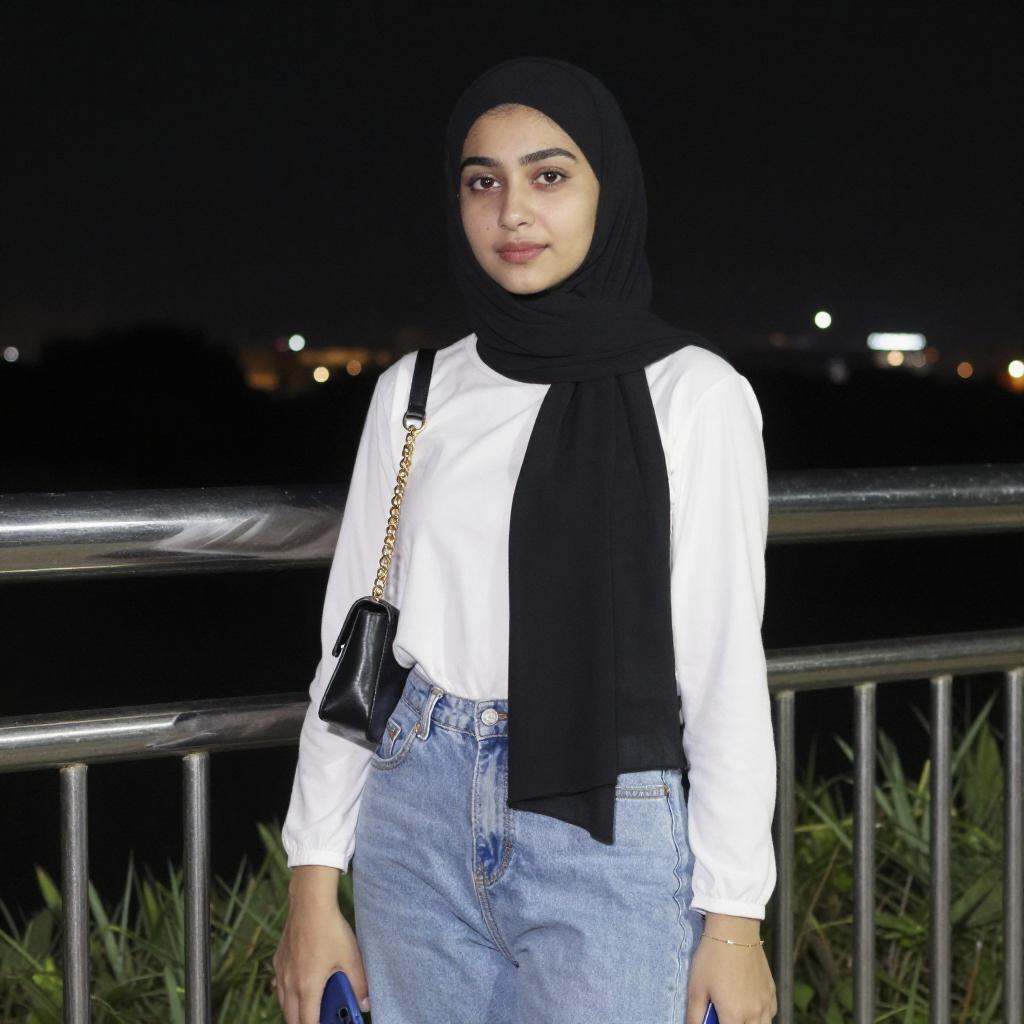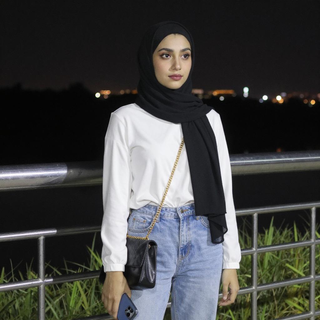 Photograph of a young woman with light skin and dark hair in a black hijab, wearing a white long-sleeve top and light blue jeans. She holds a black purse with a gold chain strap and a blue phone in her right hand. She stands against a dark night sky with city lights in the background, next to a metal railing and grass.