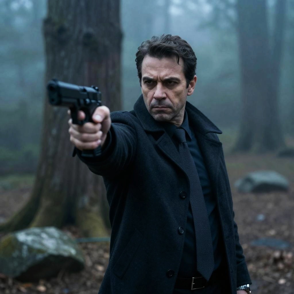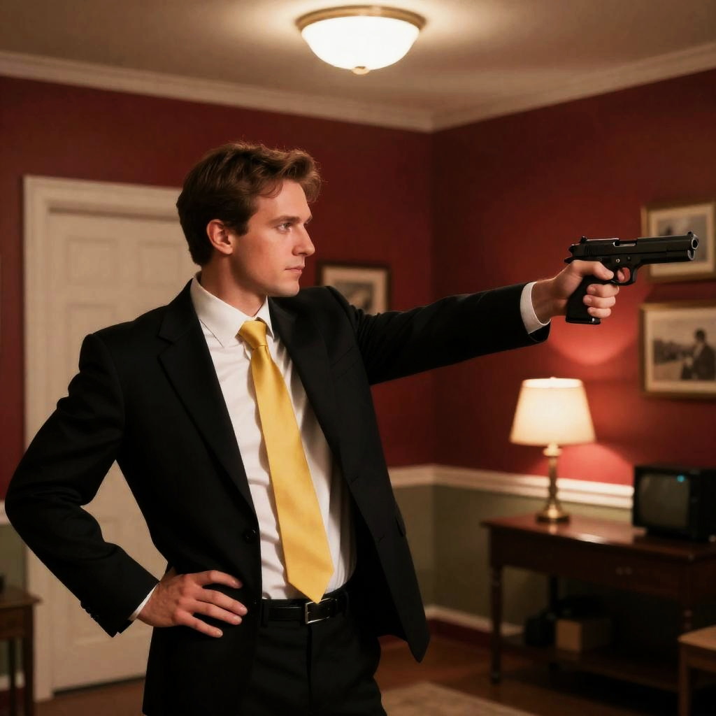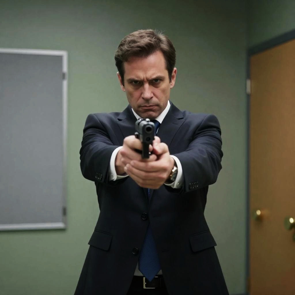 Man in dark suit, white shirt, blue tie, aiming a black handgun directly at the camera. Green-walled room, gray metal panel on the left, ured wall with gold knobs on the right. Intense expression, focused gaze. Middle-aged, short brown hair. Both hands holding the gun, fingers wrapped around the grip. Standing upright, centered in the frame.