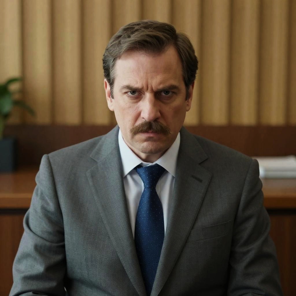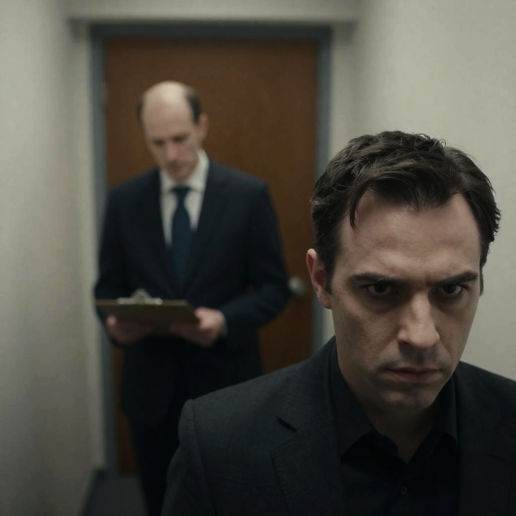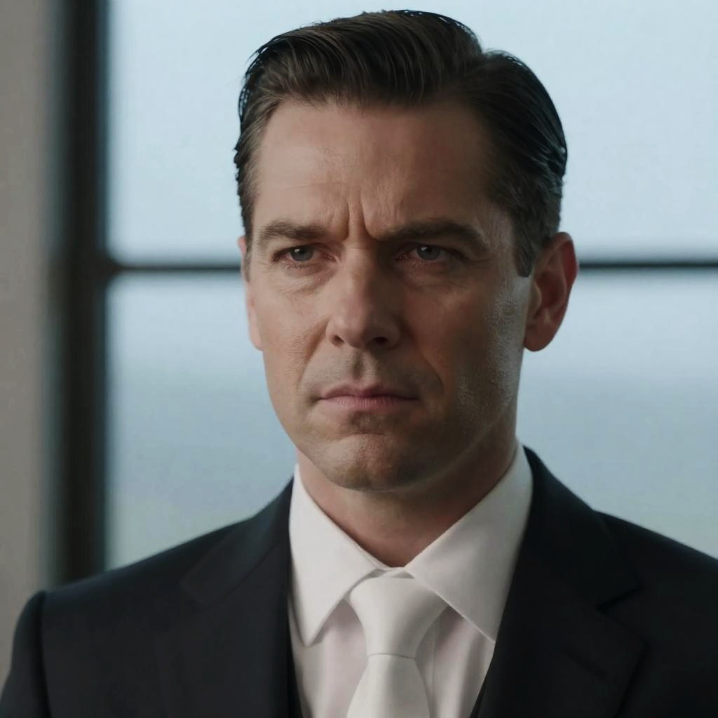 Man in dark suit, white shirt, blue tie, aiming a black handgun directly at the camera. Green-walled room, gray metal panel on the left, ured wall with gold knobs on the right. Intense expression, focused gaze. Middle-aged, short brown hair. Both hands holding the gun, fingers wrapped around the grip. Standing upright, centered in the frame.