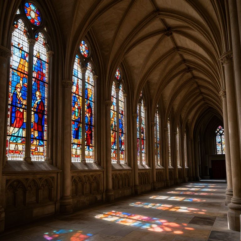 Photograph of a Gothic-style cathedral corridor with arched windows adorned with colorful, intricate stained glass. The windows feature vibrant reds, blues, and yellows, depicting various religious figures and patterns. Sunlight filters through, casting colorful, patterned shadows on the stone floor. The corridor has high, vaulted ceilings with ribbed arches, and the walls are lined with decorative stone carvings. The image is rich in contrast, with the dark corridor walls and floor juxtaposed against the bright, colorful stained glass. The scene exudes a sense of historical grandeur and spiritual serenity.