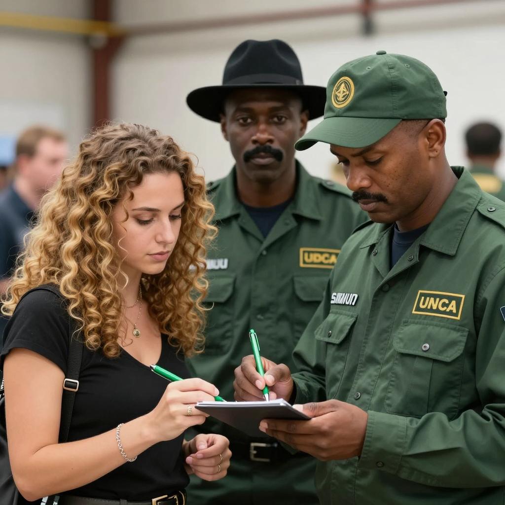 Three individuals indoors in a collaborative setting. A young woman with curly blonde hair wearing a black top signs a document with a green pen. Beside her, a man in a green uniform and matching cap, also holding a green pen, is focused on the same document. Behind them stands another man with dark skin, mustache, and wearing a green uniform and black wide-brimmed hat, looking forward. The setting appears to be industrial with blurred background figures.