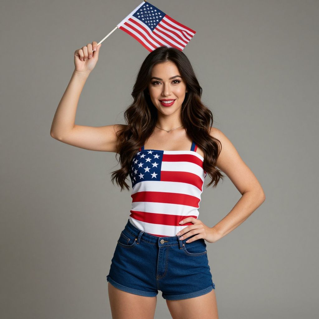 Photograph of a young woman with long, wavy dark brown hair and fair skin, smiling at the camera. She wears a sleeveless, white tank top with red and blue stripes and white stars, resembling the American flag, paired with high-waisted, blue denim shorts. She holds a small American flag in her right hand above her head. The background is a simple, solid gray. Her makeup is subtle, with red lipstick matching the flag's stripes. The image has a bright, studio-lit appearance, emphasizing her cheerful and patriotic expression.