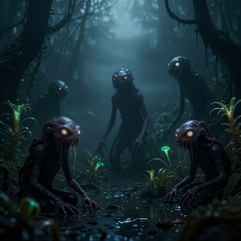 Digital artwork of eerie, dark, slime-covered creatures with glowing orange eyes lurking in a misty, blue-lit forest, surrounded by glowing plants.