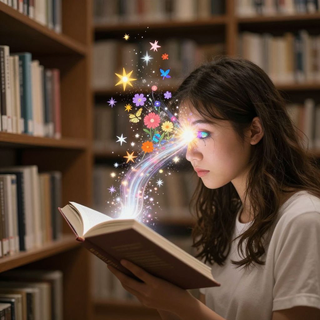 A young woman immersed in a book unleashes a vibrant cascade of stars, flowers, and butterflies from her eye, transforming the mundane library into a magical realm where imagination bursts forth like a living, luminous stream.