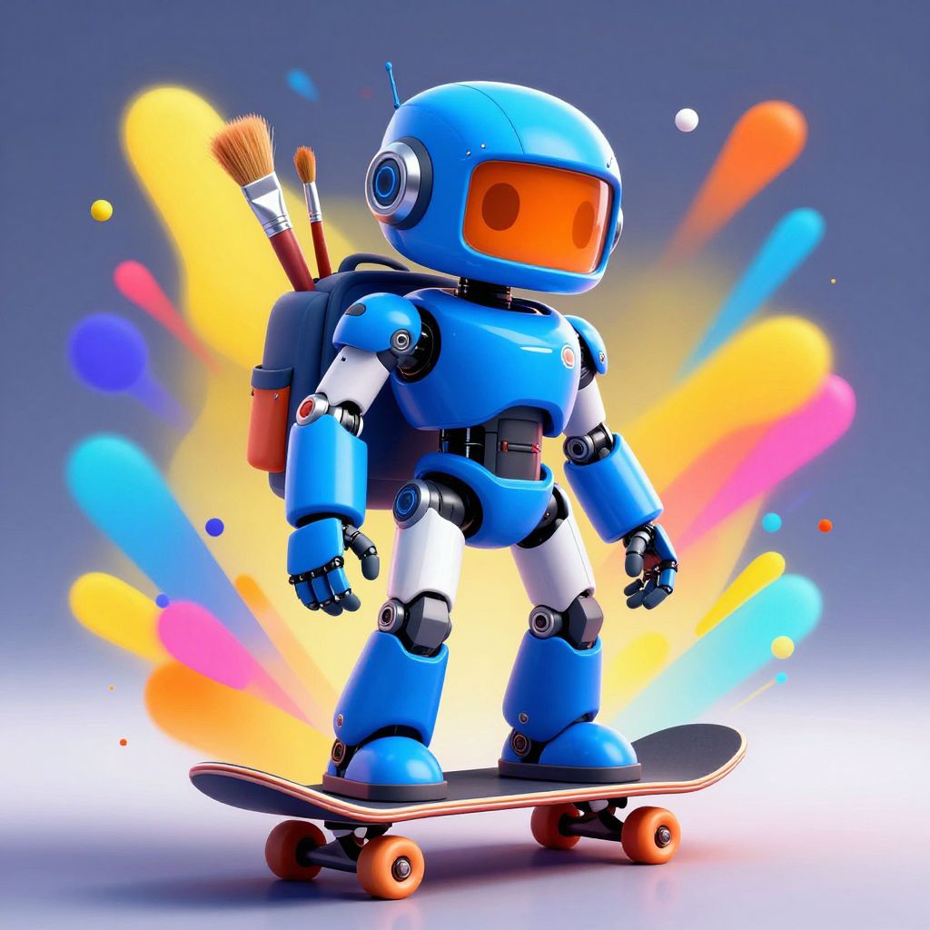 A futuristic robot standing on a skateboard, equipped with a backpack holding paintbrushes. The robot has a sleek blue design with an orange visor and is surrounded by colorful abstract shapes and paint strokes, symbolizing creativity and art.