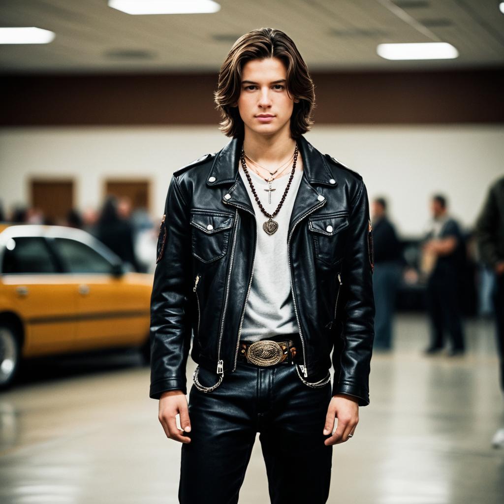 Zack fair outfit,1boy, male focus, solo, jewelry, belt, jacket, blurry background, looking at viewer, pants, leather, realistic, brown hair, blurry, standing, necklace
