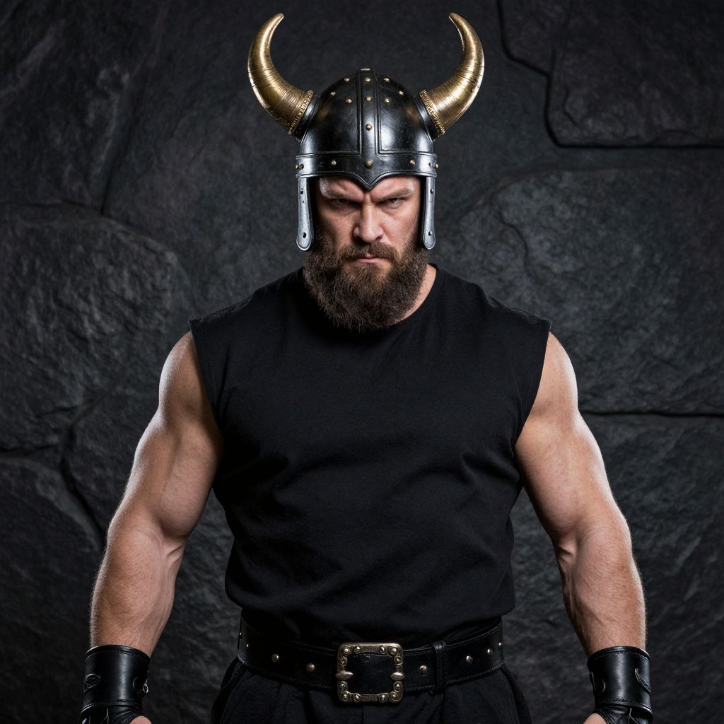Photograph of a muscular, bearded man with a serious expression, wearing a shiny black Viking helmet with gold horns. He's dressed in a sleeveless black shirt, black leather wristbands, and a black belt with a metal buckle. The background is a dark, textured stone wall, adding a medieval vibe to the image. The lighting highlights his strong arms and stern face.