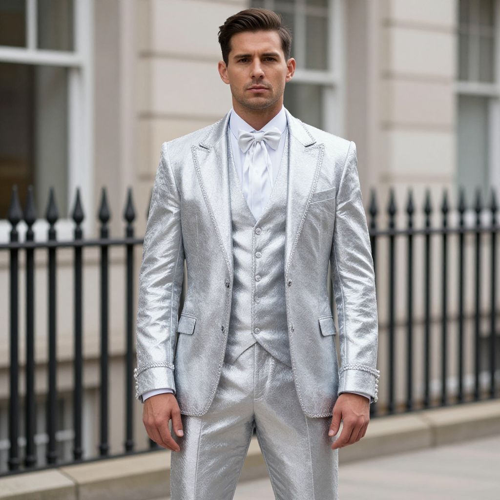 Photograph of a young, handsome Caucasian man with short, dark brown hair and a serious expression. He is wearing a shiny, silver sequined suit with a white dress shirt and a matching silver bow tie. The suit has a textured, reflective surface, and he stands confidently in front of a black iron fence and a light-colored, classical building. The background is slightly blurred, highlighting the man as the focal point of the image. The overall style is formal and stylish, with a modern, high-fashion aesthetic.