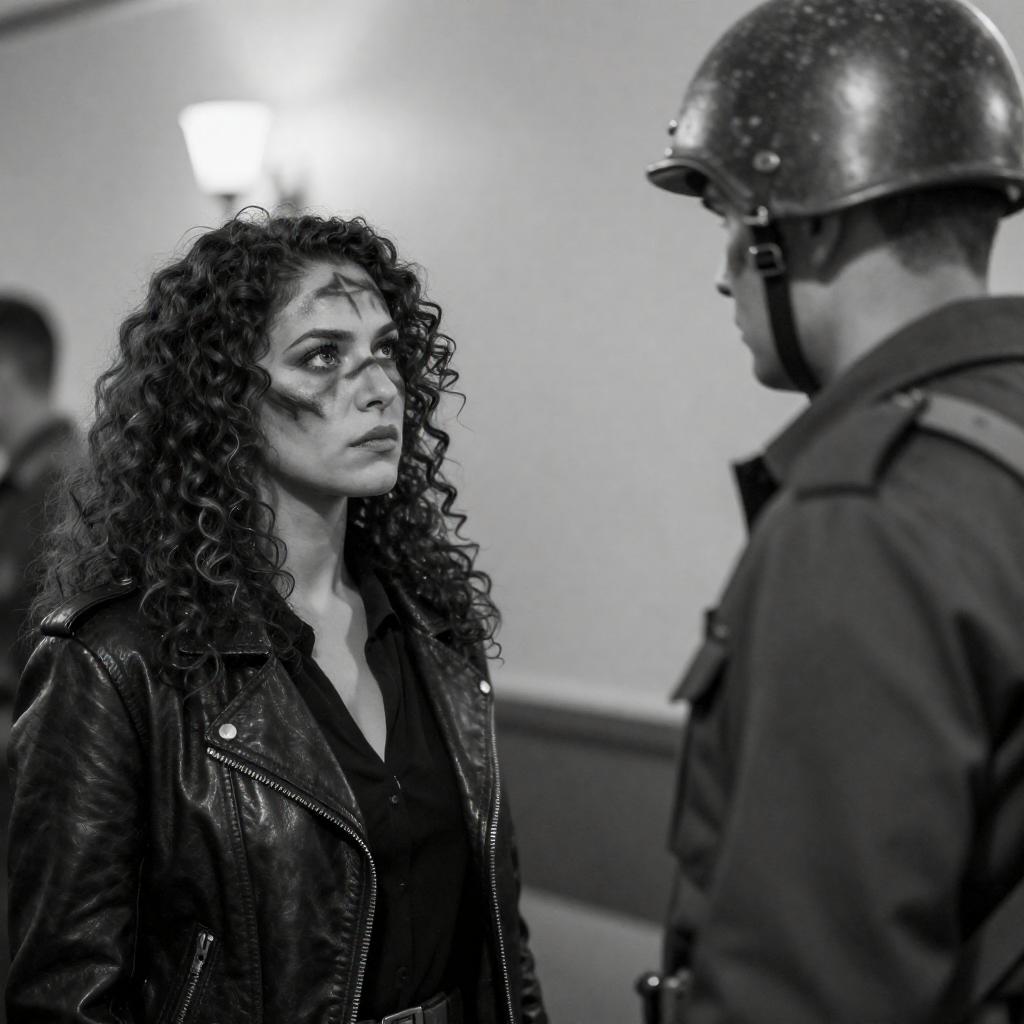 Black-and-white photograph of a woman with curly hair and intense expression, face marked with war paint, facing a soldier in a helmet and leather jacket. Soldier looks serious. Background includes a slightly illuminated wall. Two people.