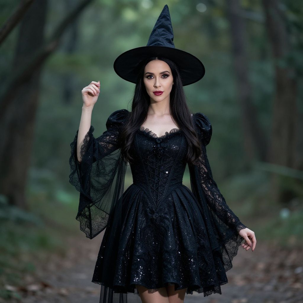 "Wicked Witch West Dress, image of a young woman dressed in a witch costume"