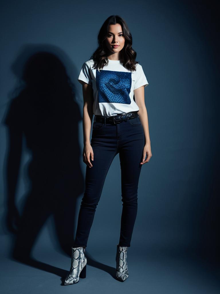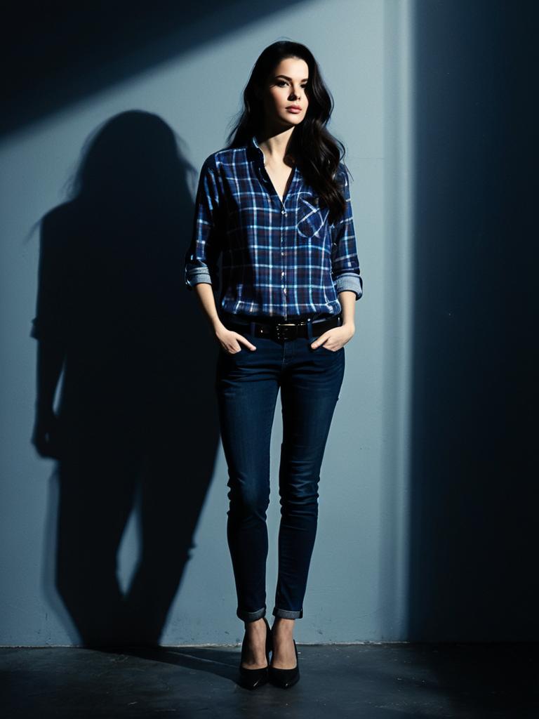 Young woman with long dark hair wearing a casual red and navy blue plaid shirt with rolled-up three-quarter sleeves and a front pocket, paired with black skinny jeans, a black belt with a simple buckle, and classic black pumps. She stands against a gray wall with dramatic lighting casting a shadow behind her.