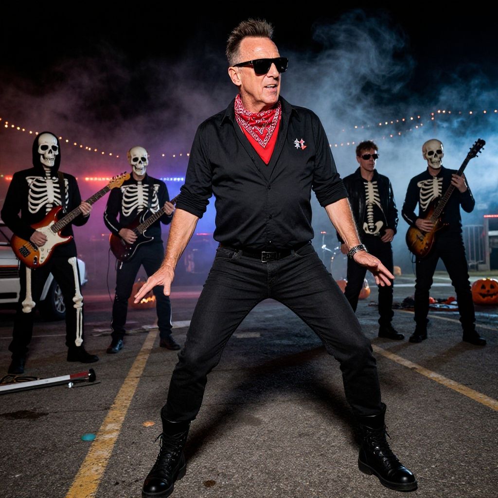 Bruce Springsteen Halloween costume featuring iconic bandana and sunglasses, black boots, group of skeletons as band members in the background, abandoned parking lot scene with Halloween lights and spooky mist, energetic performance pose
